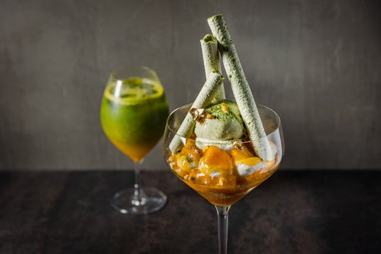 日本茶とマンゴーのティラミスパフェ Parfait au the vert japonais et tiramisu a la mangue