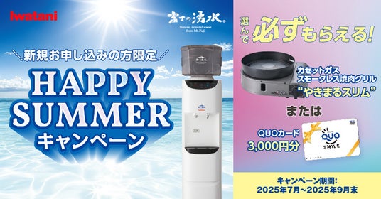 岩谷産業株式会社(本社:大阪・東京、社長:間島 寬)は、宅配天然水「富士の湧水(ゆうすい)」のウォーターサーバーを新規でご契約いただいたお客様を対象に「HAPPY SUMMERキャンペーン」を実施いたします。