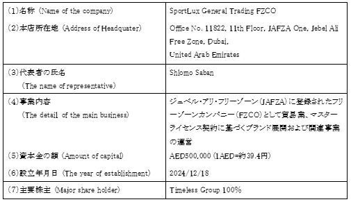 – 契約締結先: SportLux General Trading FZCO(アラブ首長国連邦・ドバイ JAFZA One, 11階, Office No.11822)