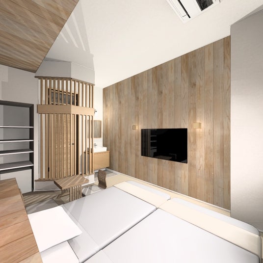 ウッドタイルの自然な温もりを感じる空間が広がる