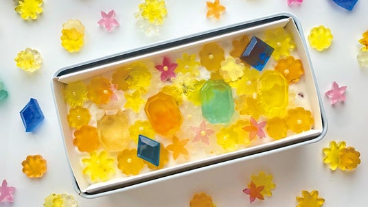 イタリア発祥のひんやりスイーツ「カッサータ」に、こうぶつヲカシ(琥珀糖)のきらめきを添えた、夏限定の特別なアイスケーキです。ベースは、リコッタチーズを使った甘さ控えめのクリーム。そこへ、芳醇なマンゴーと爽やかなレモンピールを混ぜ込み、トロピカルで涼やかな味わいに仕上げました。缶のふたを開けた瞬間、夏の花を模したこうぶつヲカシが輝き、まるで宝石箱を開けたかのようなときめきを感じていただけます。カットすれば、断面までもが光を透かして美しく、目でも舌でも楽しめる、夏だけの贅沢なスイーツです。