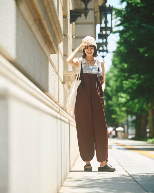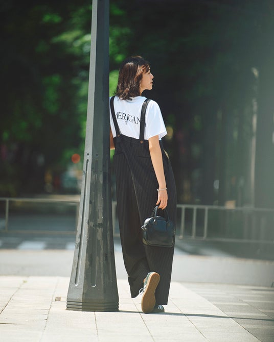 ヒップ、太もも周りの幅にかなりボリュームを持たせたサロペット。
