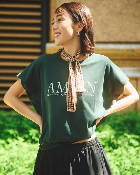 Tシャツは後ろの見頃を長めにデザインしており、背中に生地の溜まりができ膨らみが出るよう、より女性らしいシルエットで着用いただけます。