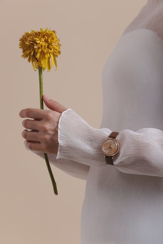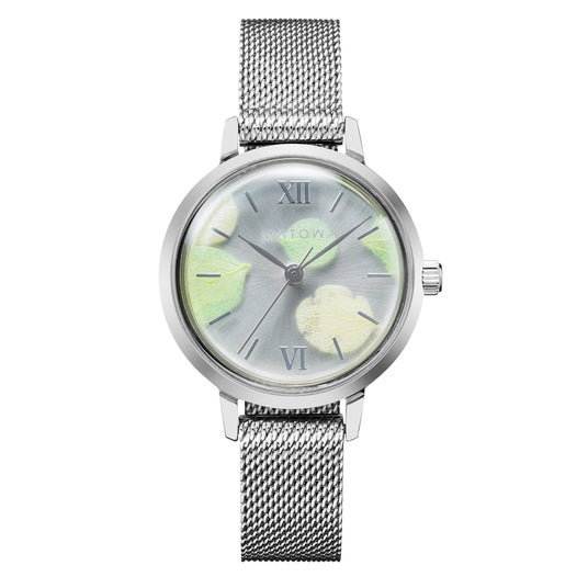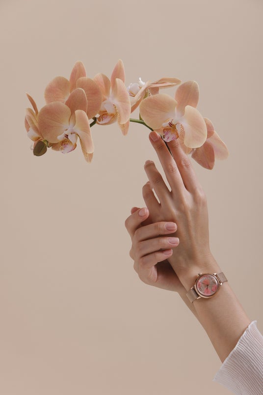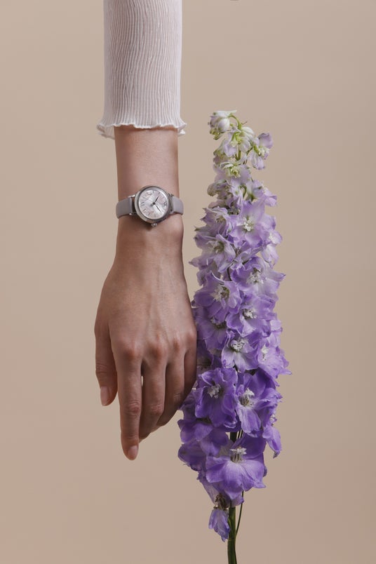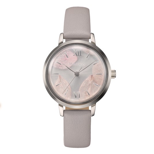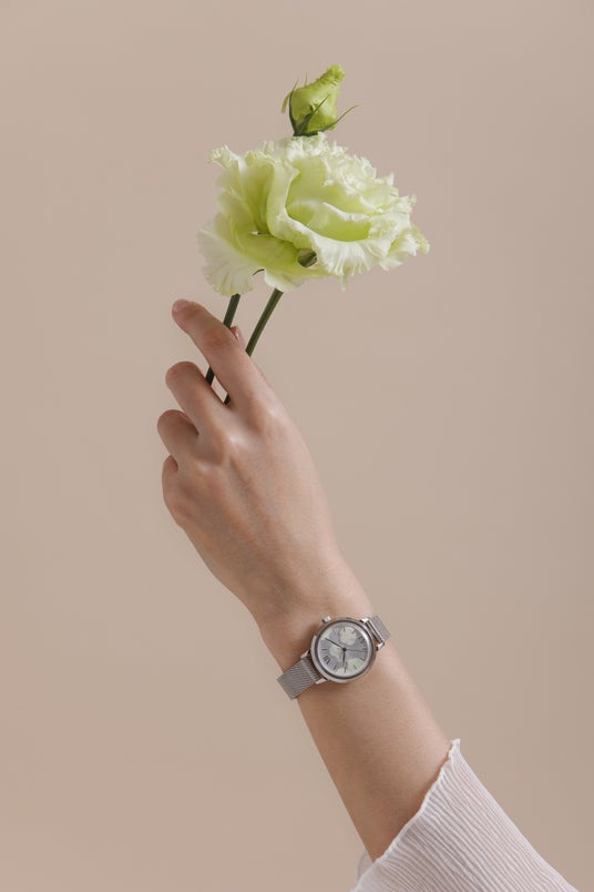 ケースサイズは30mmと、手元にすっとなじむ上品なサイズ感。カラーはローズゴールドとシルバーの2色を展開し、ストラップには落ち着いたレザーベルトと、上品な輝きのメッシュストラップを採用しました。さまざまな装いに寄り添う、全4種のバリエーションです。ムーブメントには信頼の日本製クオーツを搭載し、日常使いにも最適。天然の花びらを使用しているため、一つひとつ異なる表情を見せ、世界にたったひとつの「あなたの時計」として時を刻みます。
