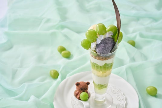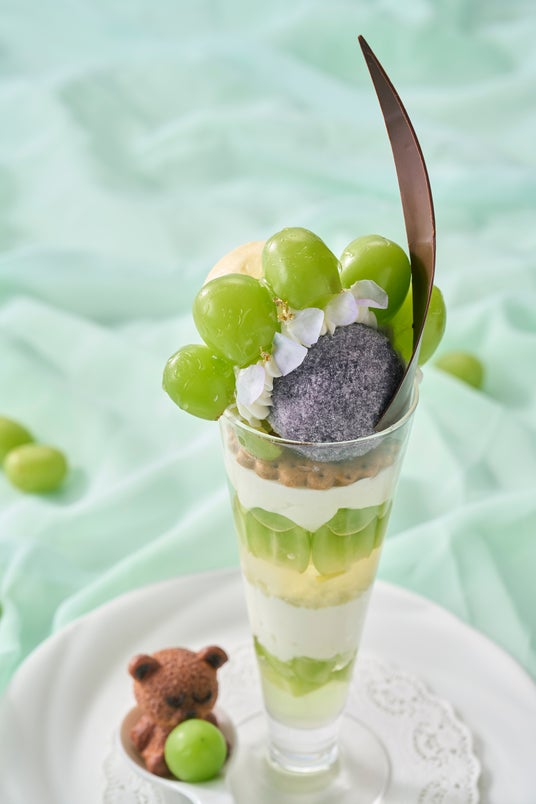 「Shine Muscat Bliss(シャインマスカット ブリス)」は、旬のシャインマスカットをふんだんに使用し、“最後のひと口までずっとシャインマスカットを愉しめる”パフェです。トップにはシャインマスカット、巨峰のシャーベット、アイスミルクなどをあしらい、グラスの中には爽やかなレモンゼリー、ナタデココ、クレームダンジュなど見た目も食感も愉しめる層が重なります。食べ進めるごとに、シャインマスカットと冷たいアイスクリーム、そしてスイーツのハーモニーが口いっぱいに広がります。
