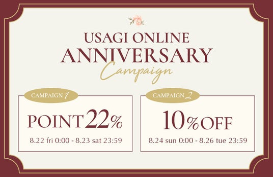 株式会社ウサギオンライン(本社:東京都千代田区/代表取締役社長:須藤 誠)が運営するオンラインデパートメントストア「USAGI ONLINE(ウサギオンライン)」は2025年8月にデビュー12周年を迎えます。 12周年を記念し、8月22日(金)~8月26日(火)の期間、感謝祭と銘打ち 期間限定一律22%ポイントキャンペーンの実施や、USAGI ONLINEでしか買えない限定アイテム、12周年にちなんだ12星座コレクション、話題のイケメンの登場など楽しい企画を順次展開いたします。