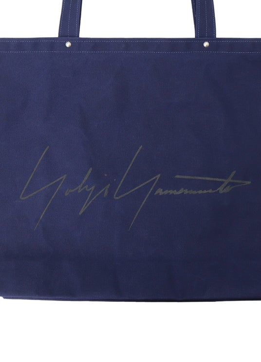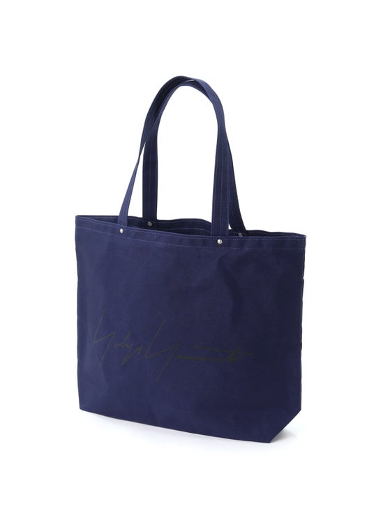 ヨウジヤマモト青山本店でノベルティとして取り扱っているオリジナルトートバッグと同じ形を、一澤信三郎帆布で特別に製作したトートバッグは、第一弾のコラボレーションで登場した黒に加えて、今回、紺が新たに登場。