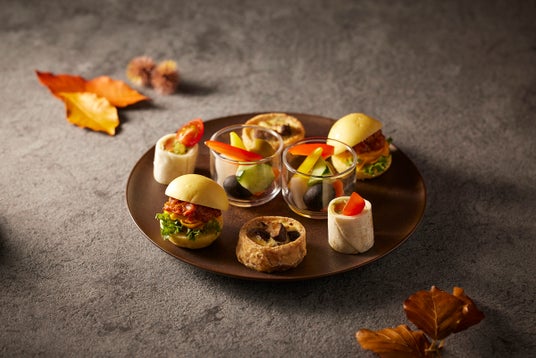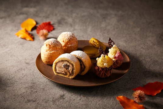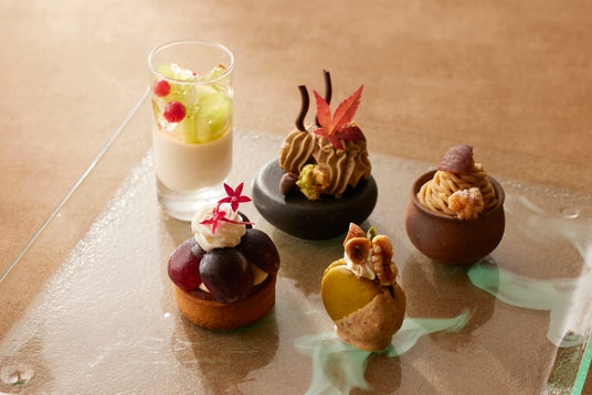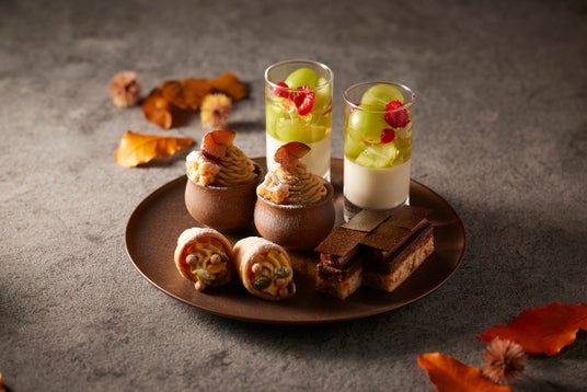 贅沢に使用した巨峰が口いっぱいに広がる「巨峰のタルト」、熊本県産栗を使用し栗本来の上品な甘さが楽しめる「モンブラン」、シャインマスカットとぶどうのジュレをブランマンジェに重ねた華やかなグラスデザートなど、秋の実りを祝うスイーツが揃います。さらに日本ならではの素材を取り入れた「黒豆とほうじ茶のティラミス 秋のガーデンスタイル」や「木の実のマカロン」など、繊細な味覚もご用意。