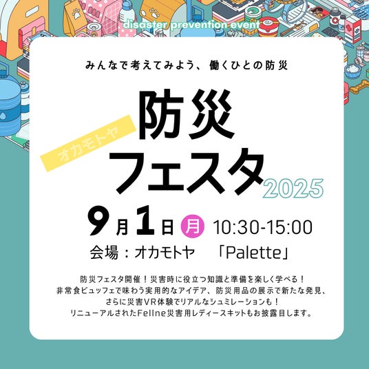 働く人の安心を届けるFellne災害用レディースキットのリニューアルを記念して、9月1日の防災の日に「防災フェスタ2025」を開催します。災害対策をもっと身近に、楽しく学べる機会として、昨年も大好評だった「非常食ランチ会」を今年はビュッフェスタイルで実施します。働く人の災害への備えを一緒に考えていきます。
