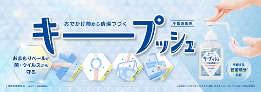 「キープッシュ手指消毒液」は持続する殺菌成分と、手肌にやさしい保湿成分を配合。べたつかない速乾タイプで、普段使いにちょうどいい手指消毒液です。持続する殺菌成分が膜(おまもりベール)となり、菌やウイルスから守ります。