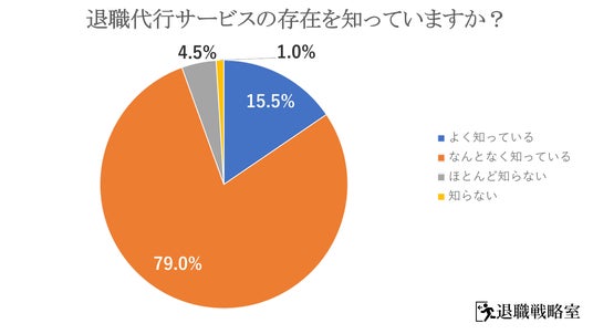 退職代行サービスを「よく知っている(15.5%)」「なんとなく知っている(79.0%)」と回答した人は94.5%に上り、ほとんどの人が退職代行サービスを認知している結果となりました。