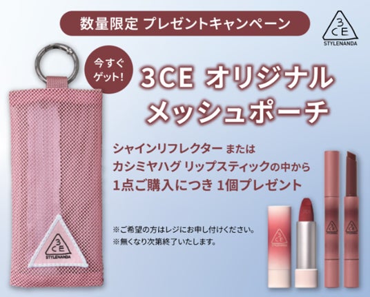 今回の新作発売を記念して、一部店舗限定で対象リップ製品をご購入いただいたお客様に、ここでしか手に入らない「3CEオリジナルメッシュポーチ」をプレゼントいたします。