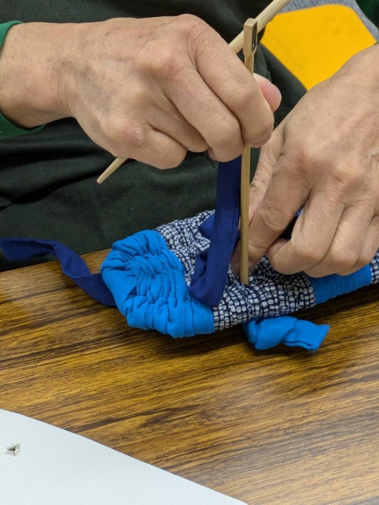 素材に触れ、布の端を探り、裂き、編んで、結ぶ。最初はうまくいかない。ほどいては編み直し、またほどく。