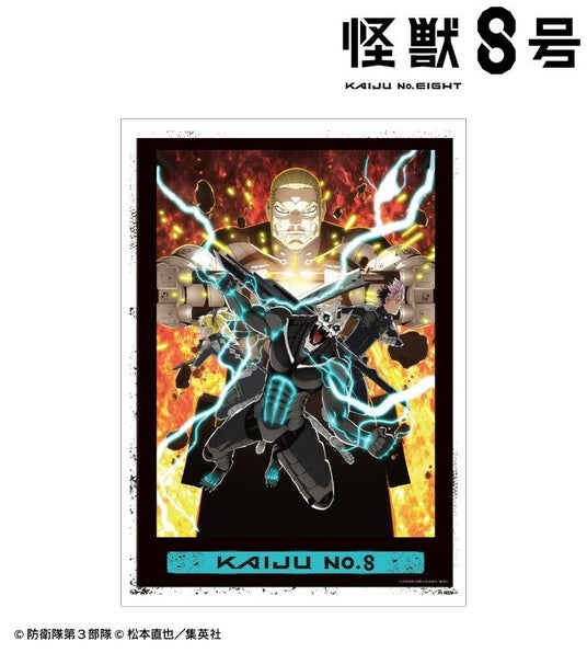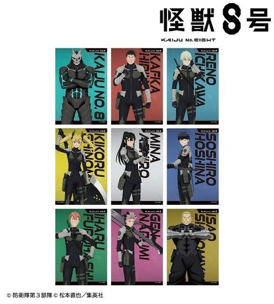 怪獣8号、日比野カフカ、市川レノ、四ノ宮キコル、亜白ミナ、保科宗四郎、古橋伊春、鳴海弦、四ノ宮功のイラストをブロマイドに仕上げました。