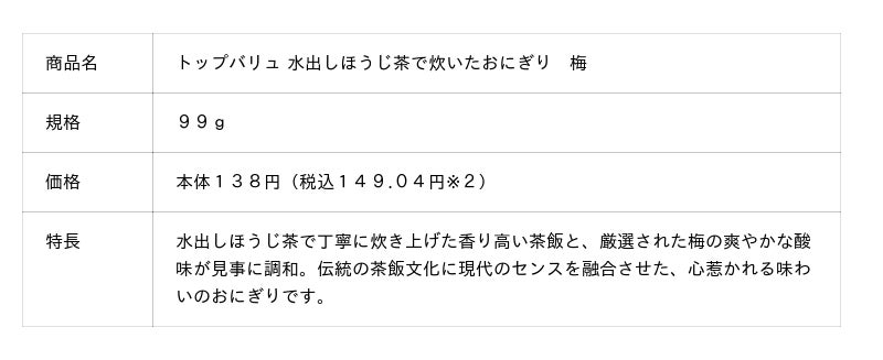 伝統の技と革新的な発想が融合した「トップバリュ 水出しほうじ茶で炊いたおにぎり」で、日本の食文化の新たな価値をご提案します。