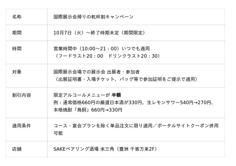 日本一の中央卸売市場の食のテーマパークである【豊洲 千客万来】内にあるSAKEペアリング酒場「米三角」(所在地:東京都江東区、運営:株式会社浜友E.F. 代表取締役:大石恵司)は、東京・有明に位置する国際展示会場での展示会に出展・参加される皆様を対象とした「国際展示会帰りの乾杯割キャンペーン」を開始いたします。