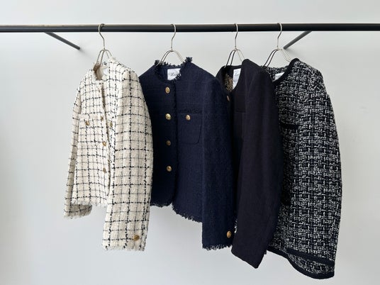 アーカイブの生地を使用したサスティナブルなツイードジャケット過去に展開していたツイード生地を使用し、ブランドがこつこつ集めていたアンティークボタンを取り付けたアソートのツイードジャケット。