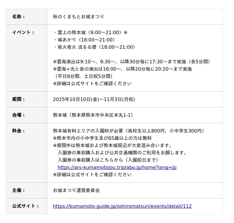 特別史跡熊本城跡で秋と春に継続して開催している「秋のお城まつり」は以下の内容で開催されます。