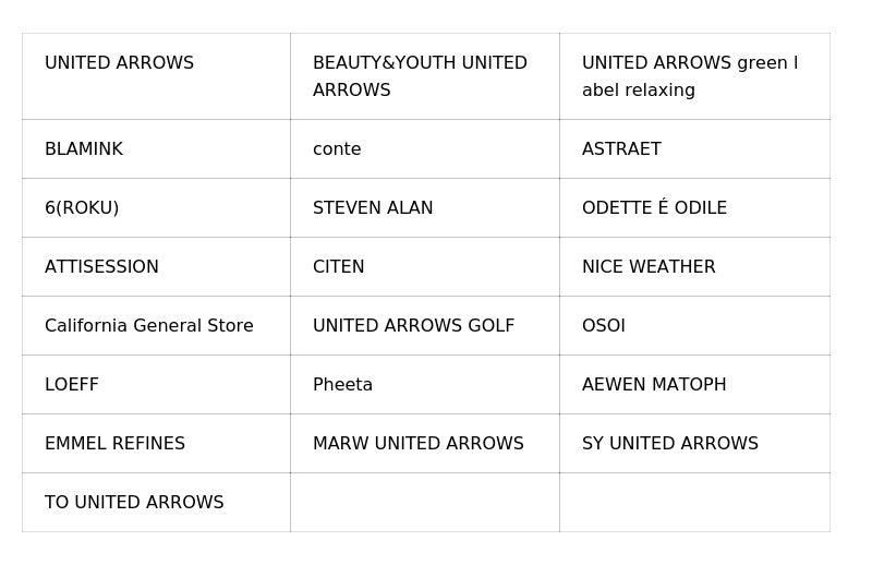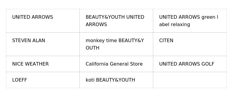 1989年創業。独自のセンスで国内外から調達したデザイナーズブランドとオリジナル企画の紳士服・婦人服および雑貨等の商品をミックスし販売するセレクトショップを運営しています。「ユナイテッドアローズ」「ビューティー&ユース ユナイテッドアローズ」「ユナイテッドアローズ グリーンレーベル リラクシング」などのブランドやレーベルを展開。