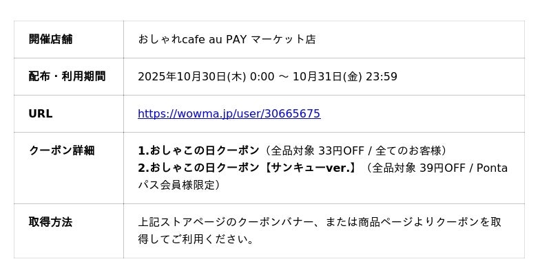 コスメから医薬品、暮らしの便利グッズまで取り扱う「おしゃれcafe」を運営するピュアクリエイト株式会社(本社:埼玉県熊谷市)は、お客様への感謝を込めた毎月月末恒例の独自イベントとして、「おしゃこの日クーポン」を今月は10月30日(木)・31日(金)の2日間にわたって配布することをお知らせいたします。期間中、全てのお客様が使える通常版に加え、Pontaパス会員様限定の特別なクーポンもご用意し、お客様の月末のお買い物を応援します。