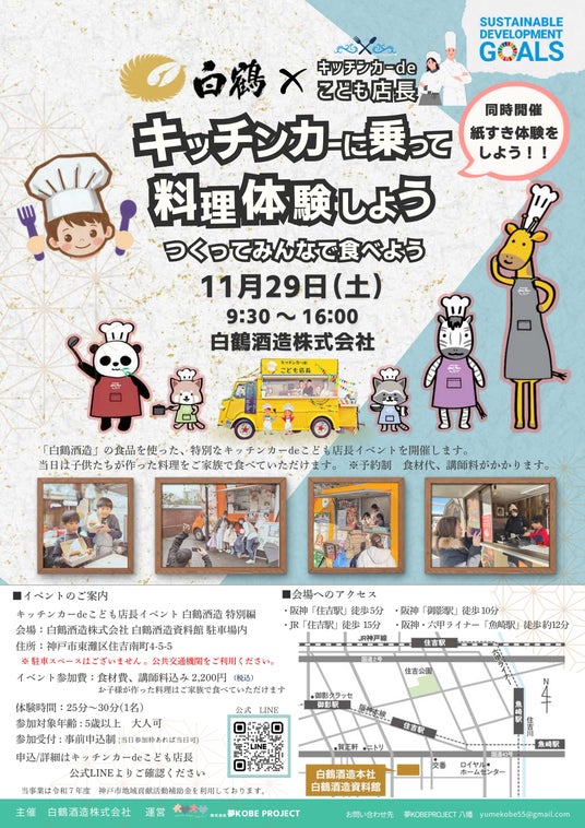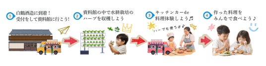 キッチンカーdeこども店長(※1)と白鶴酒造株式会社は、2025年11月29日(土)に事前予約制のイベント「キッチンカーに乗って料理体験しよう」を白鶴酒造の本社敷地内で開催します。キッチンカーdeこども店長とは、キッチンカー事業者と共にこどもがキッチンカーに乗って料理を行うもので、今回のイベントでは白鶴の食品(酒粕、あまざけなど)を使った料理やスイーツなどを作ります。料理体験の様子は、保護者の方も見学可能で、作った料理をその場で食べることができます。今回は、白鶴酒造資料館内の室内農業装置で育てたハーブ(※2)を自分で摘み取り、料理に使用してもらう予定です。