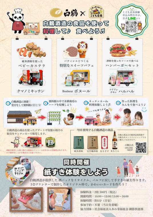 また、イベント当日は販売専用のキッチンカーも出店し、白鶴の酒粕を使用した粕汁やお菓子などを販売します。料理体験に参加されない方も、販売ブースなどでお楽しみいただけます。さらに、地元の障害福祉作業所「御影俱楽部」も出店し、サケパックをリサイクルした紙すきのワークショップも体験していただけます。