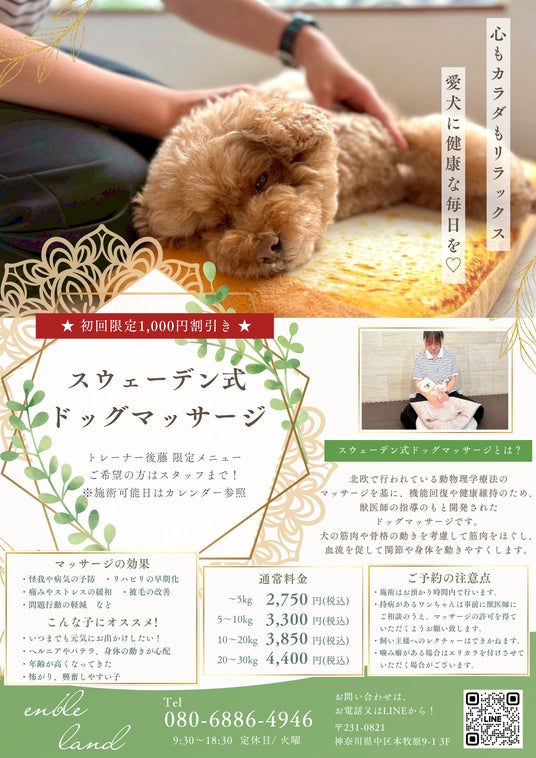 M.SLASH(株式会社EVO:神奈川県横浜市、代表取締役:衣山頼之)が運営するドッグサロンenbleにて、新サービス「スウェーデン式ドッグマッサージ」と「出張プライベートレッスン」を開始いたします。