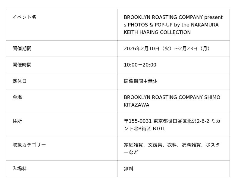 中村キース・ヘリング美術館(山梨県・小淵沢)は、2026年2月10日(火)~2月23日(月)の期間、BROOKLYN ROASTING COMPANY SHIMOKITAZAWA(東京都・下北沢)にて、写真展とポップアップショップを開催します。