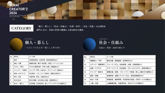MIRAI CREATOR’Z 2026では、30部門にわたり若者の選出を実施予定です。各分野で活躍する若者を広く発掘し、その活動内容や背景にある想いも含めて社会に発信します。