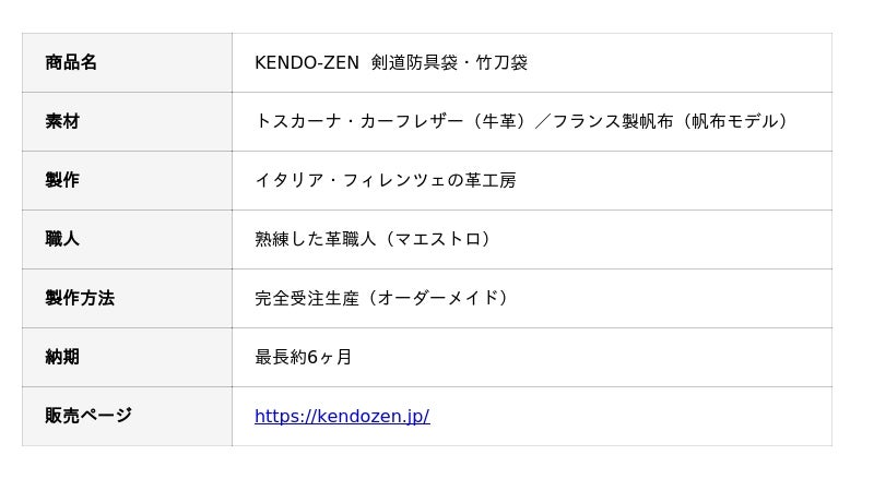 このたび、イタリア・フィレンツェ伝統の革工房とタイアップし、熟練の革職人(マエストロ)がひとつひとつ丹念に手づくりする、総革製の最高級剣道防具袋・竹刀袋「KENDO-ZEN」の完全受注生産が開始されました。イタリア製の剣道防具袋・竹刀袋は、これまでに例を見ない試みです。