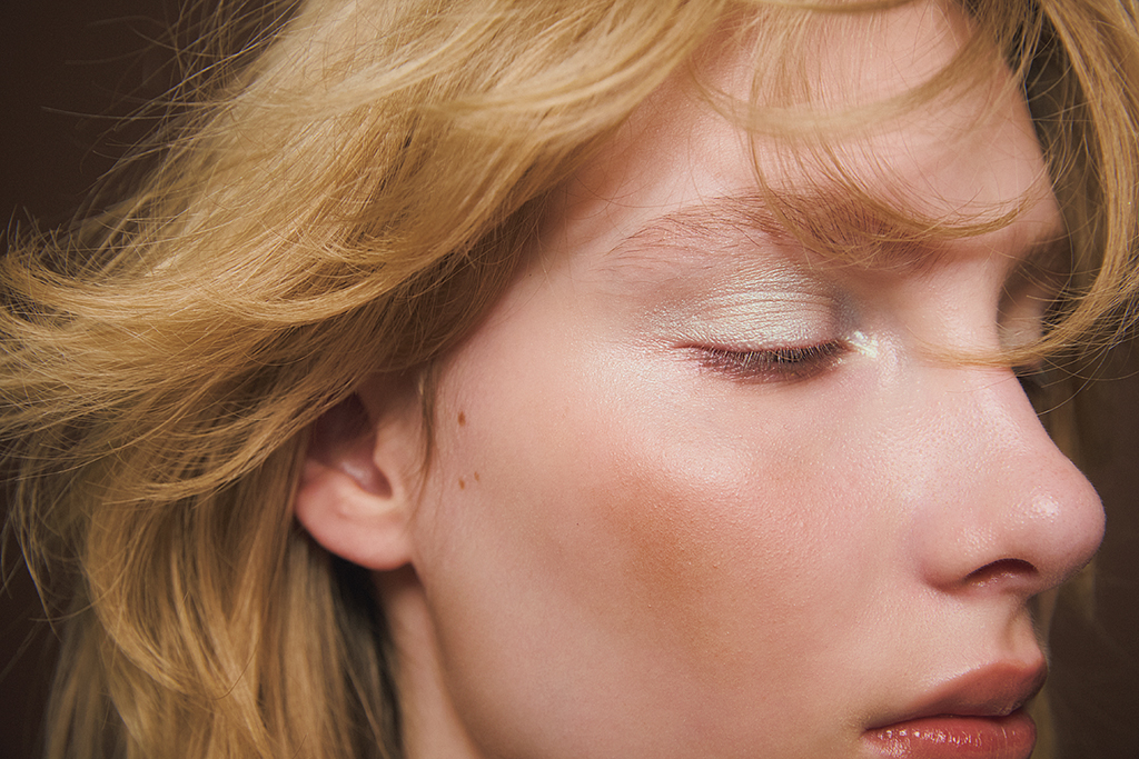 ① 目頭の下あたりからこめかみまで、大きめのブラシを使って広範囲にA.を塗布。ブラシをななめ上下に数往復させると、偏光パールがキレイに輝き、表情の華やぎがアップする。