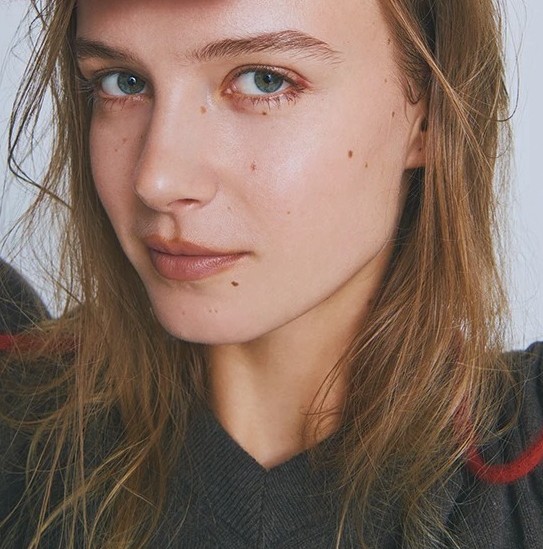 「aのチークもbのリップも透け感があってこっくりとした印象になりすぎず、カジュアルにまとえます。ニット&デニムにさらっと合わせるだけでもさまになる」(笹本恭平さん・ヘアメイク)