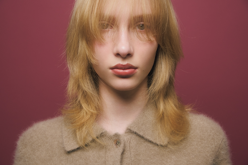 装いの色みに重さがあるぶん、メイクは淡いカラーで組み立ててメリハリづけを。エレガントであり愛嬌もあるラベンダーのヴェールで染めたら、淑女でレトロな甘さが加わる。 ニット 22,000円/HER. 中に着たニット 12,000円/バナナ・リパブリック