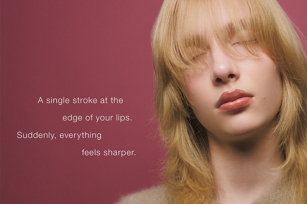 次に2のグロスをレイヤード。 全体に塗るのではなく「唇の上下中央だけ」に重ねる。 中央にだけツヤを集めることで、口元を動かすたびに繊細な光が出現。マットなベースとのコントラストで、ふっくらとした立体感が際立つ。
