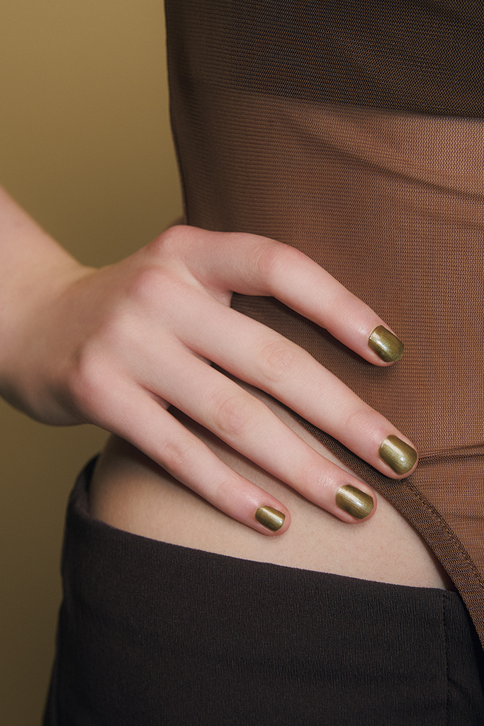 上下をダークブラウンでそろえたスタイリングに、わずかに渋さのあるグリーン系ネイルが相愛。さまざまな偏光パールが入っていることで、濃密な中にみずみずしさと奥行きがあり、指先を美しくしなやかに演出してくれる。こちらは、一度塗りだと透け感のある発色。よりシックで深みのある手元をめざすなら、2度塗りがベター。