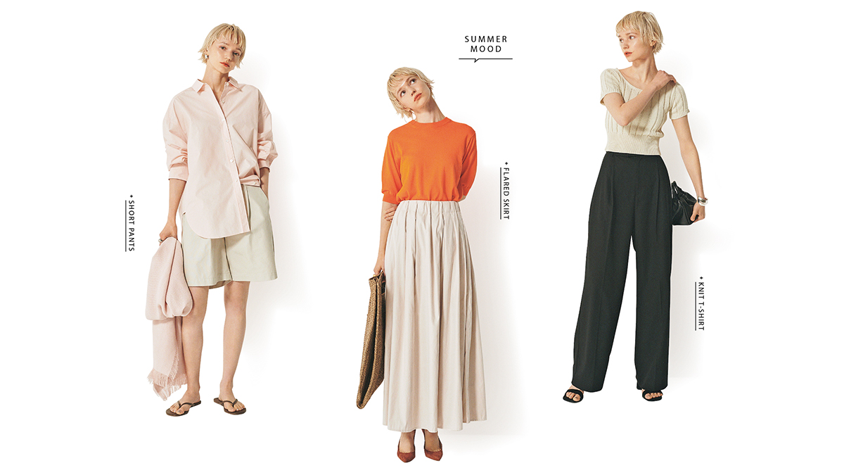 鮮やかなオレンジをなごませる、白というよりベージュに近いあせたアイボリー。フレアスカートの落ち感も功を奏して発色のインパクトを自然と抑制。