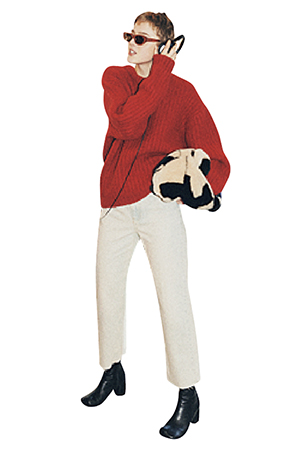 (右)スキニーとストレートの間のような絶妙シルエット。ブリーチをかけたような、白っぽいブルーデニムには、暖色のニットでわかりやすく温度を上げて。品よく甘さも補える、深い赤を採用。