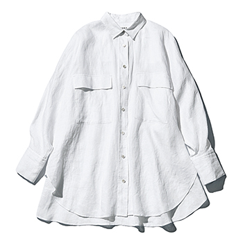 リネンシャツ 39,600円/SACRA(インターリブ) 夏に向けて1着は持っておきたいリネンシャツも白で軽快に。合わせやすい小さめのえり、肩のステッチがないため、オーバーサイズでも体から浮かず、膨張感を軽減。