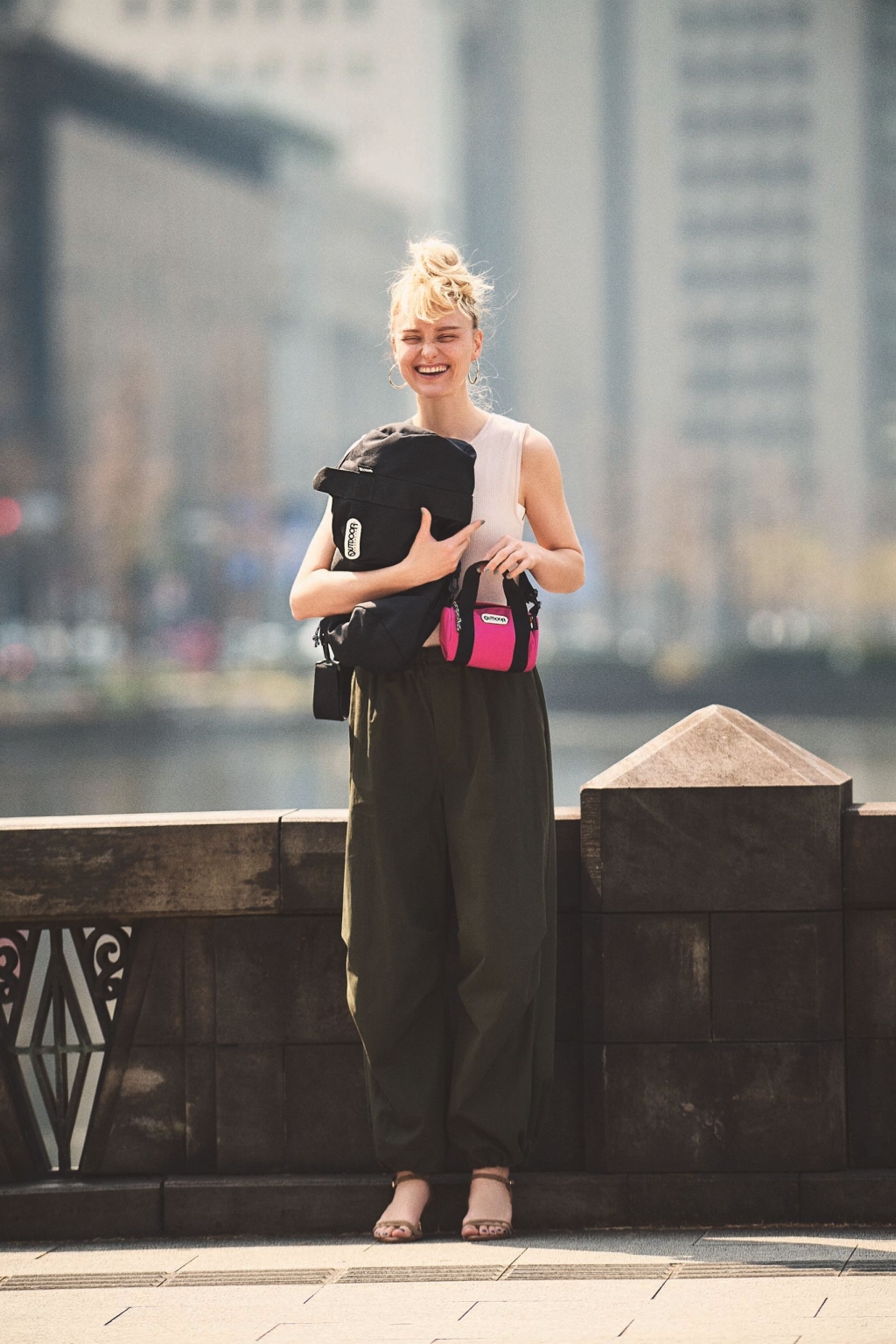220ボストンバッグ (10×18×10) 3,080円、231ボストンバッグ (22×44× 22) 5,280円/ともにアウトドアプロダクツ(OUTDOOR PRODUCTS カスタマーセンター) トップス 25,300円/FLORENT パンツ 19,800円/MANOF ピアス 2,310円/mimi33(サンポークリエイト) サンダル 8,910円/RANDA インナー/スタイリスト私物 ロールボストンはショルダーストラップつきで、シーンや装いに合わせて持ち方のアレンジも自在。