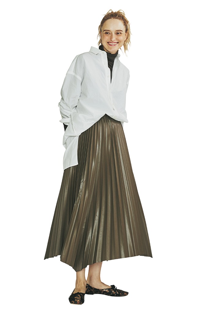 白シャツとフレアスカートは着まわし。タートルネックニット 27,500円/アンデコレイテッド シューズ 42,900円/ピッピシック(トゥモローランド) シャツの下に仕込むタートルネックは、体にフィットする薄手を選べばもたつきにくい。靴は華やかでリッチな雰囲気をもたらすレオパード柄のジャカードをセレクト。