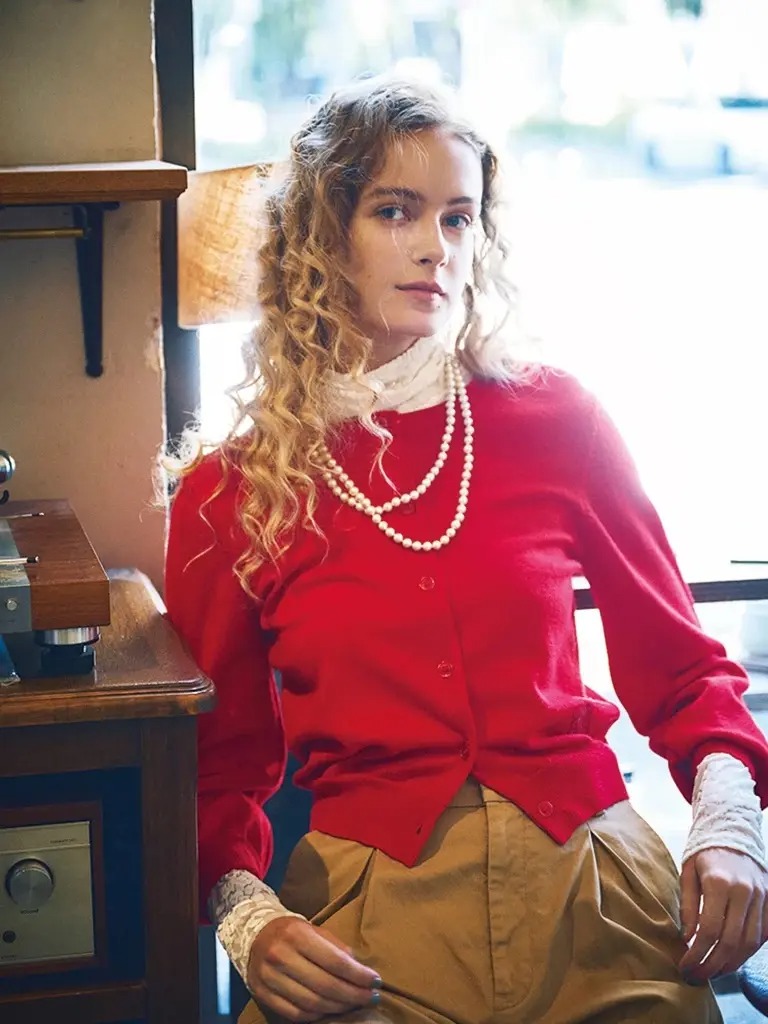羽織りアイテムやスウェット、ニットなどとセットで着るレーストップスが1枚あると便利。そでだけ広がりのあるショート丈のカーディガンを大胆にまくって、インナーのレースを効かせ、長めカフスのようにアレンジ。