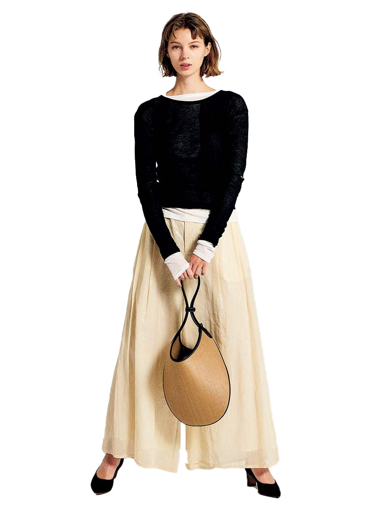 キャミとほのかに透ける黒ニットをレイヤード。白のワイドパンツにタックインすれば、コンパクトな黒ニットもいっそうきゃしゃに。首もととそでにあしらわれた少量のフリルも、シンプルな装いのメリハリ役にちょうどいい、ひかえめな存在感。