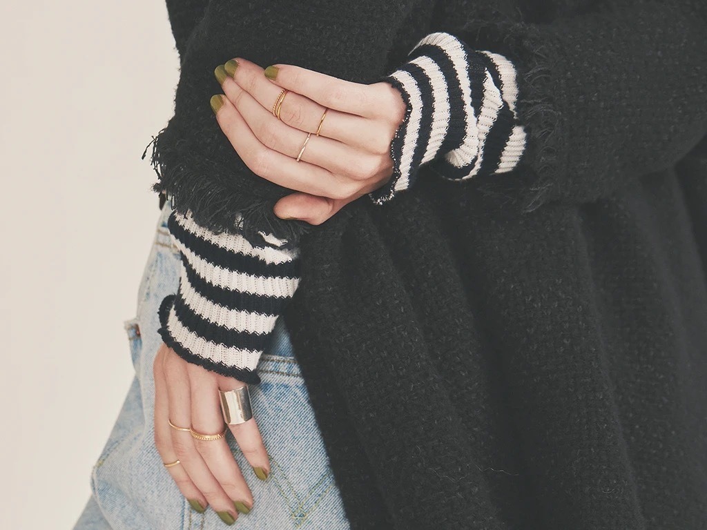 品格あるツイードを日常に引き寄せるため、デニムを合わせるのはもはや常とう手段。長めなそでのボーダーを手首にたるませて、ジャケットのそでから露出。仕上げに第2関節をおおうモダンなリングを添えて、小さくカジュアルダウン。きゃしゃなリングも飾り、女らしさをキープ。