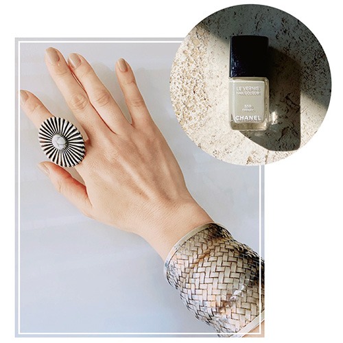 「リングはエナソルーナ、バングルはバリ島で購入したもの。最近はボリュームのあるアクセサリーをつけがちです。シャネルのグレージュネイルはシルバーアクセとの相性がいいので、必然的に出番が多くなります。」