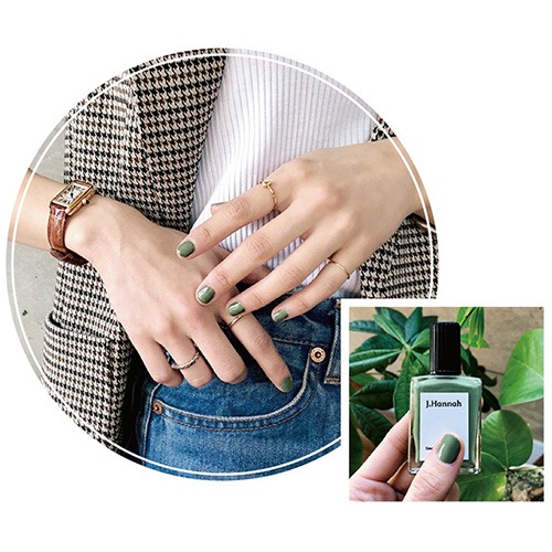「きゃしゃなゴールド、サファイアつき、キルティングモチーフやメンズライクなシルバー、端正な腕時計。少しずつ集めたお気に入りを全部盛りにしてもまとまるのは、絶妙なグリーンのネイルがつないでくれるから。」