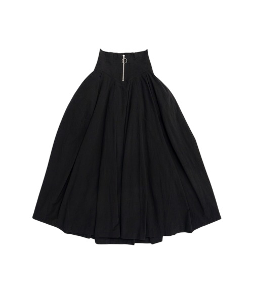 光沢をおさえたマットなポリエステル素材。広がるというよりもふくらんだコクーンシルエットは、黒で選べば幼く見えず丸みフォルムをクールダウン。ギャザーや切り替えの効いた立体感が、シンプルなトップスでも地味に陥らない奥行きを加算してくれる。