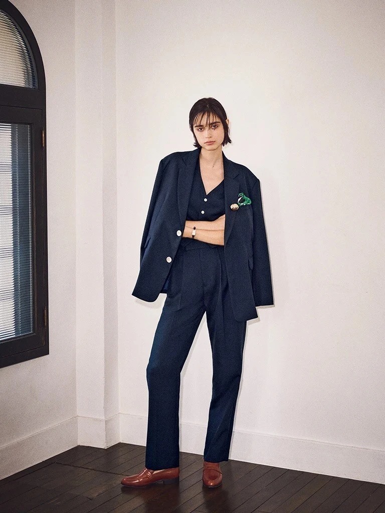 ナイロンジャケット×トラックパンツのまとめ役として、王道な濃紺テーラードを投入。そでをたくしあげ、あえてきちんと着ないことで親しみを残して。ネイビーのコンサバ度がおさえられ、フレッシュに。