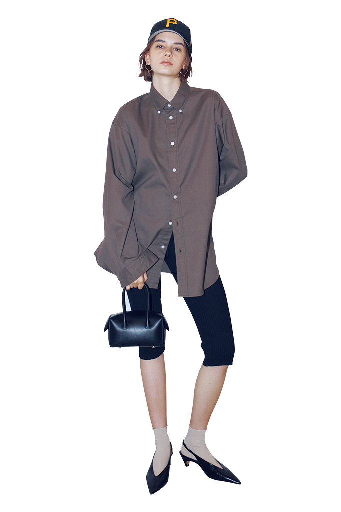 ブラウンシャツ 20,900円/ザ・ノース・フェイス(ゴールドウイン カスタマーサービスセンター) 黒パンプス 35,000円/バナナ・リパブリック 黒共布ショルダーつきバッグ 19,800円/アドカラム(アンソロジー) 黒リブニットレギンスパンツ 35,200円/パン(エディット フォー ルル) キャップ 4,620円/’47 ピアス 22,000円/Jouete ソックス 2,200円/ブルーフォレ(LITTLE LEAGUE INC.)