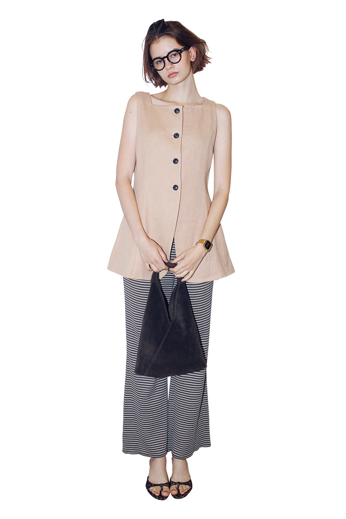 ブラウン×白ボーダーニットパンツ 25,300円/PHEENY キャメル×黒レオパード柄ミュール 8,990円/MANGO キャメルリネンベスト 29,700円/エモエレ(アダム エ ロペ) ブラウンスエードバッグ 15,400円/ミロス(ル タロン 有楽町マルイ店) 眼鏡 49,500円/モスコット(モスコット トウキョウ) 時計 7,150円/カシオ クラシック(カシオ計算機 お客様相談室)