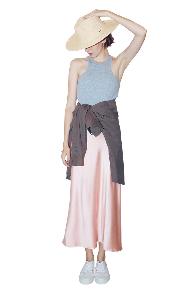 ブラウンシャツ 20,900円/ザ・ノース・フェイス(ゴールドウイン カスタマーサービスセンター) グレーリブタンクトップ 6,600円/SLOBE IENA(SLOBE IENA 自由が丘店) ピンクサテンフレアスカート 8,990円/MANGO 白スニーカー 5,940円/FEDERAL PRISON INDUSTRY(メイデン・カンパニー) ハット 21,780円/ブリクストン(ブリクストン トウキョウ) ピアス 9,350円、ブレスレット 9,900円/ともにソーク(アンソロジー)